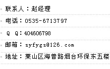 聯(lián)系人:趙經(jīng)理 電話:0535-6713797 傳真:0535-6713797